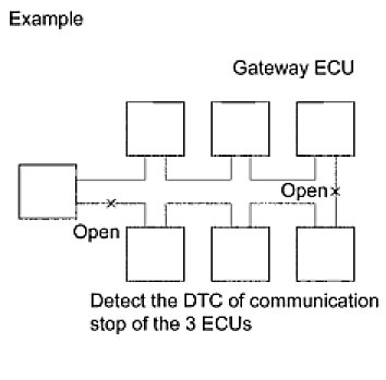 (c) If 2 communication buses are open at the points shown in the illustration, the DTC of ECU communication stop between those 2 buses is output.