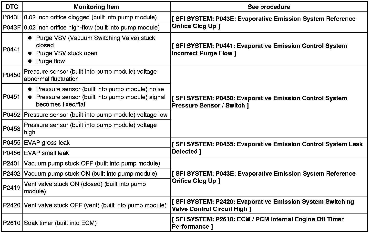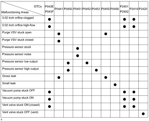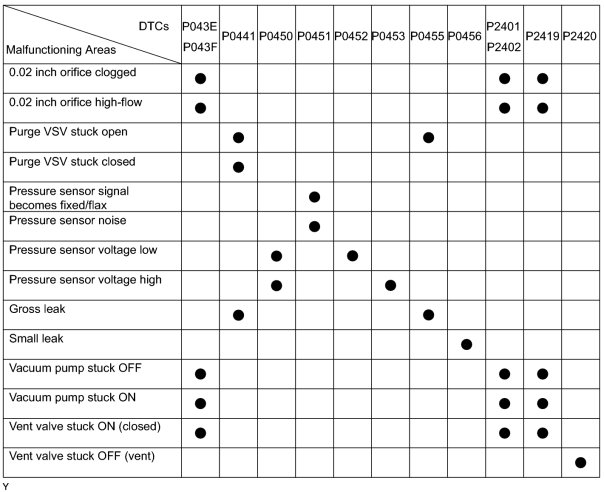 If any EVAP system DTCs are set, the malfunctioning area can be determined using the table below.