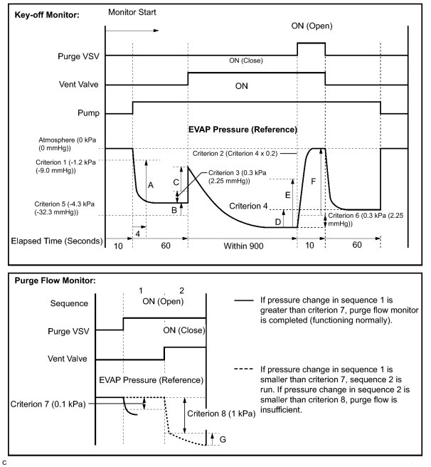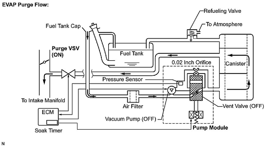 While the engine is running and the purge VSV (Vacuum Switching Valve) is ON (open), the ECM monitors the purge flow by measuring the EVAP pressure change. If negative pressure is not created, the ECM begins the 2nd monitor.