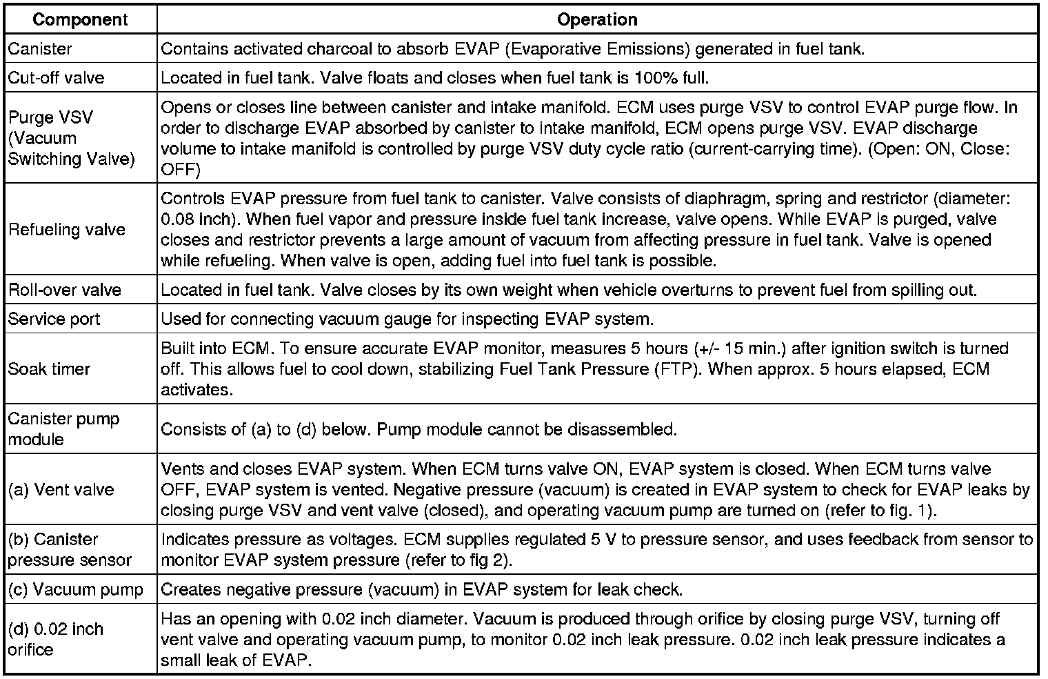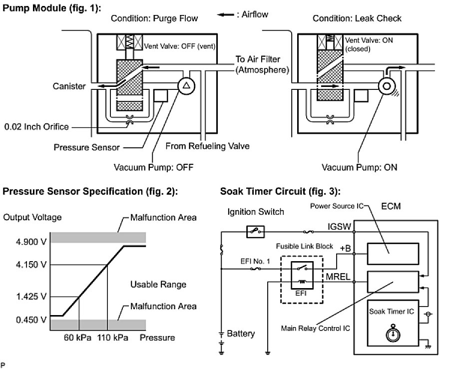 The electric vacuum pump creates negative pressure (vacuum) in the EVAP system, and the pressure is measured. Finally, the ECM monitors for leaks from the EVAP system and malfunctions in both the pump module and purge VSV, based on the EVAP pressure.