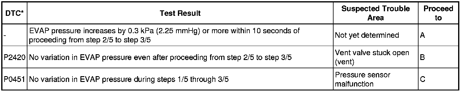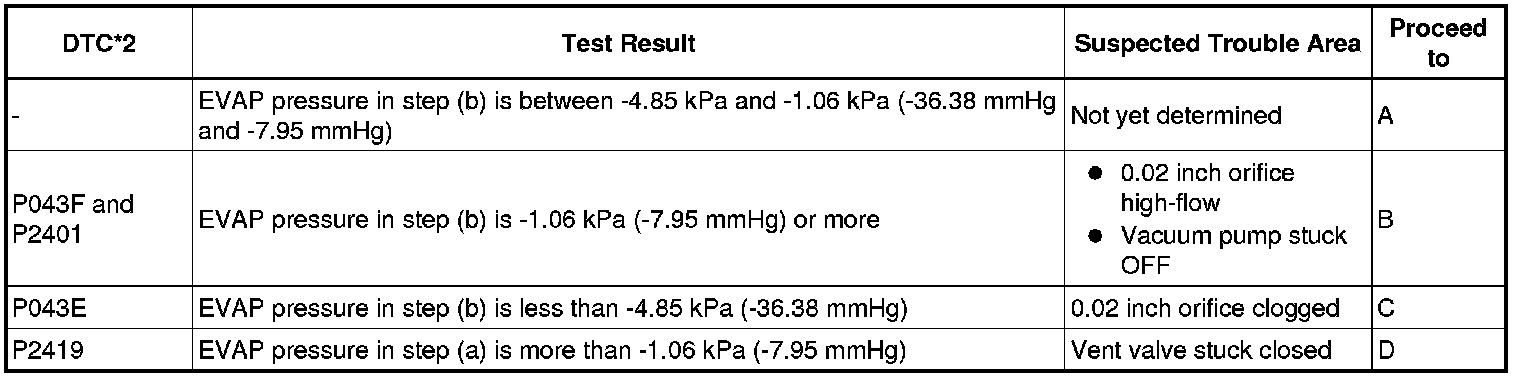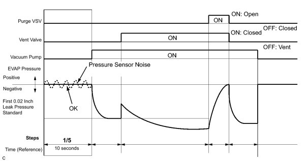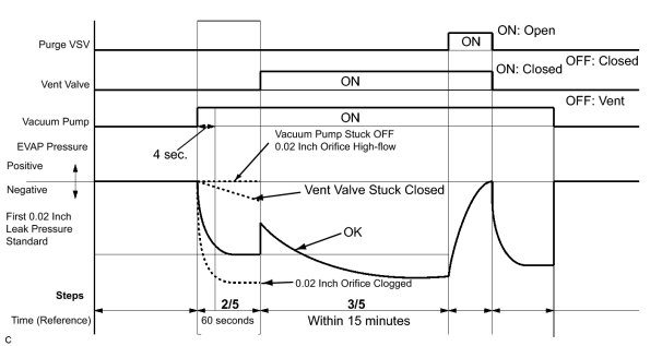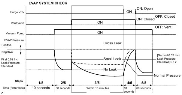 NOTE: If the 0.02 inch reference pressure difference between the first and second checks is greater than the specification, the DTCs corresponding to the reference pressure (P043E, P043F, P0441, P0455, P0456, P2401, P2420) will be all stored.