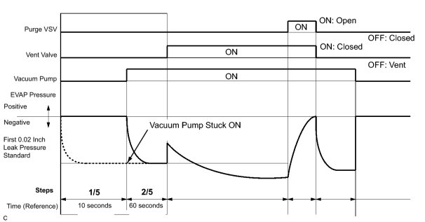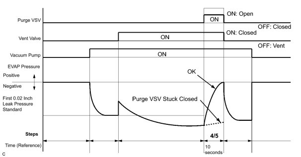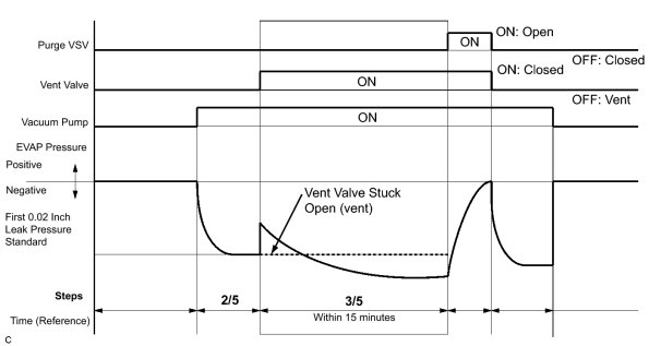 The vent valve is turned OFF (open) and the EVAP pressure is then measured. If the variation in the pressure is less than 0.5 kPa (3.75 mmHg), the ECM interprets this as the purge VSV being stuck closed, and illuminates the MIL and sets DTC P0441 (2 trip detection logic).