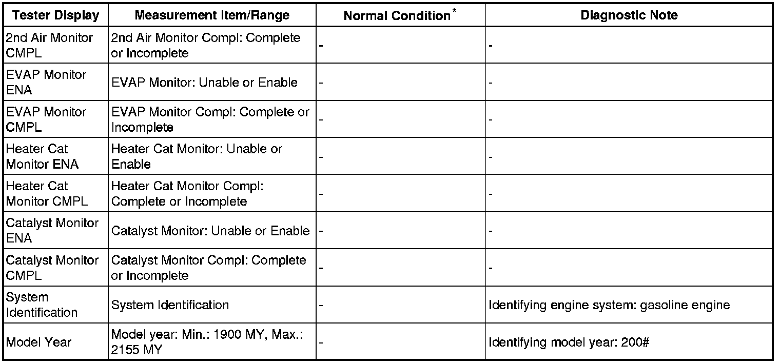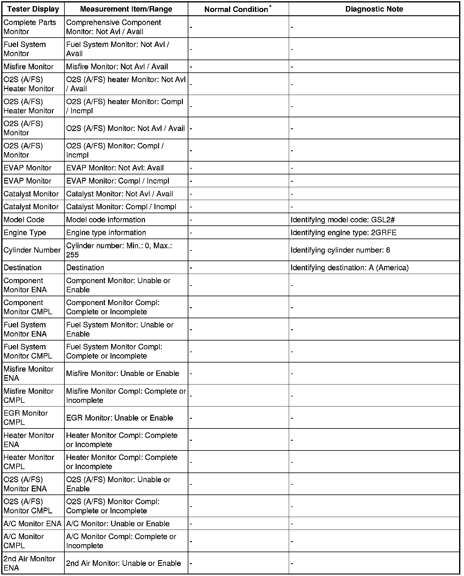 NOTE: In the table below, the values listed under Normal Condition are for reference only. Do not depend solely on these values when determining whether or not a part is faulty.
