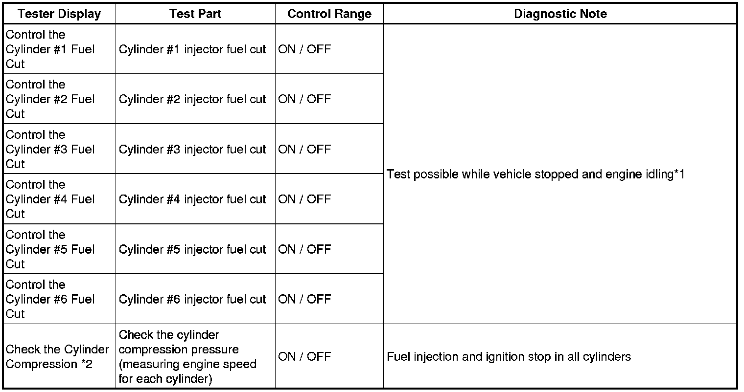 HINT: *2: When performing the Active Test item "Check the Cylinder Compression" and then cranking the engine, the ECM stops the fuel injection and ignition, and measures the engine speed for each cylinder.