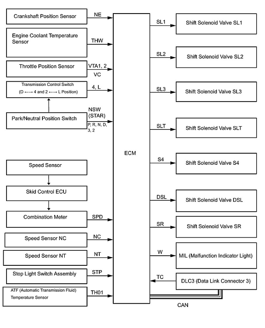 The configuration of the electronic control system in the U151E automatic transaxles is as shown in the following chart.