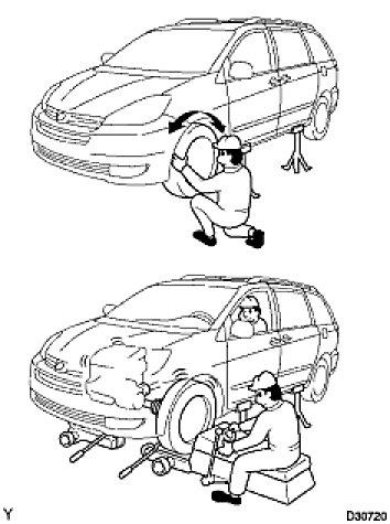 When doing on-vehicle wheel balancing on a full-time 4WD vehicle, to prevent the wheels from rotating at different speeds in different directions from each other (which could damage the center differential), always be sure to observe the following precautions: