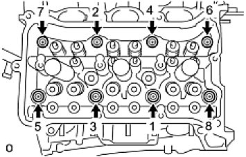 Using a 10 mm bi-hexagon wrench, install and uniformly tighten the 8 cylinder head bolts with the plate washers in several steps in the sequence shown in the illustration.