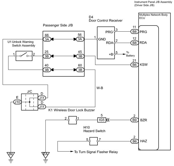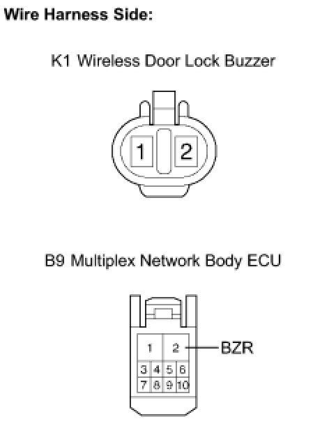 - The buzzer circuit is built into the multiplex network body ECU, not into the buzzer itself.
