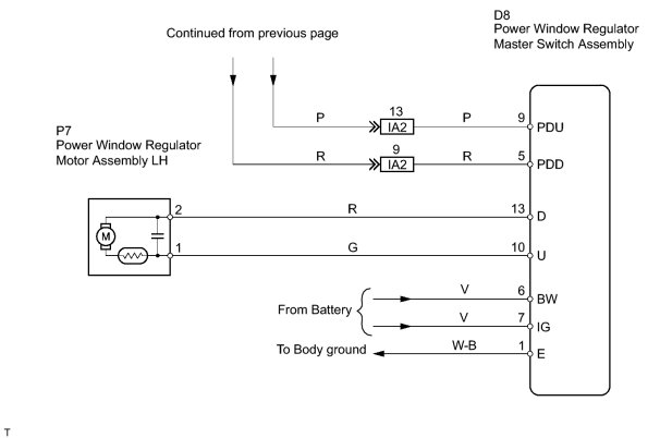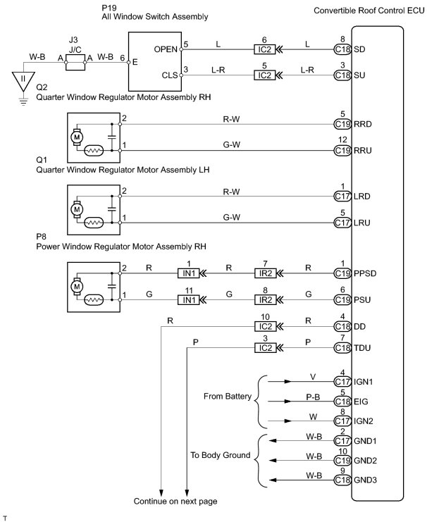 The all window switch can operate all the power windows. The all window switch outputs signals to the convertible roof control ECU which activates the passenger, quarter LH/RH window regulator motors directly. For the driver window regulator motor, the convertible control ECU outputs signals to the master switch, and the master switch activates the driver window regulator motor.