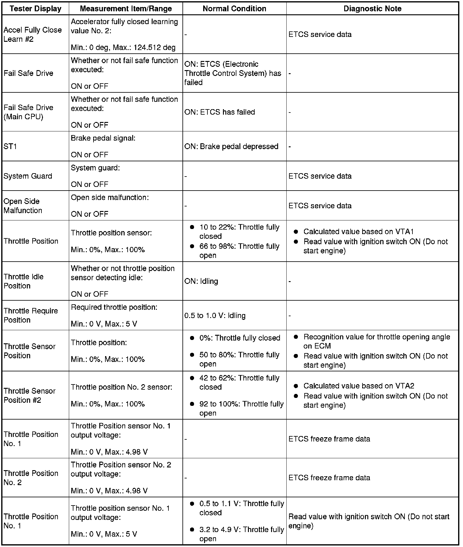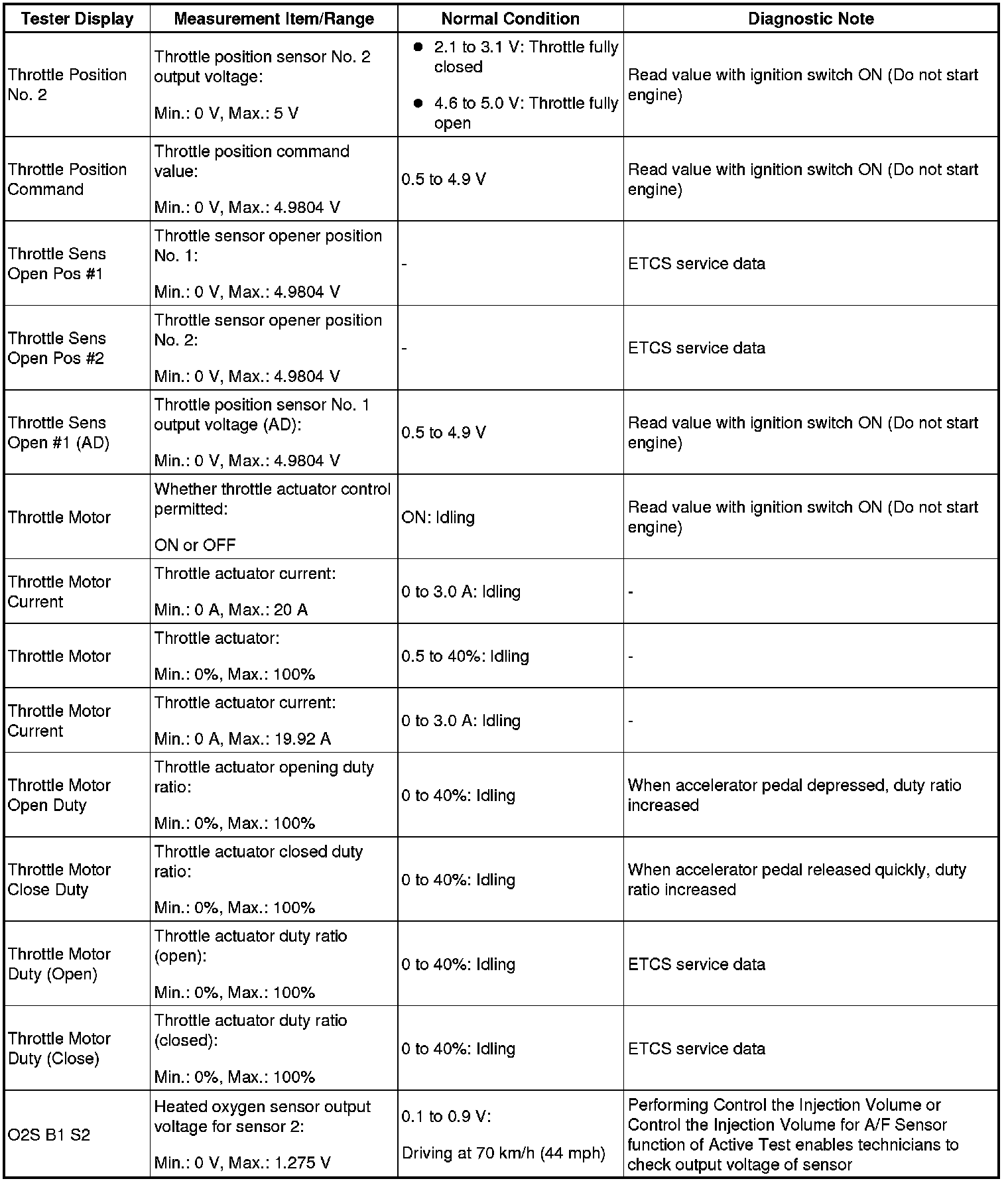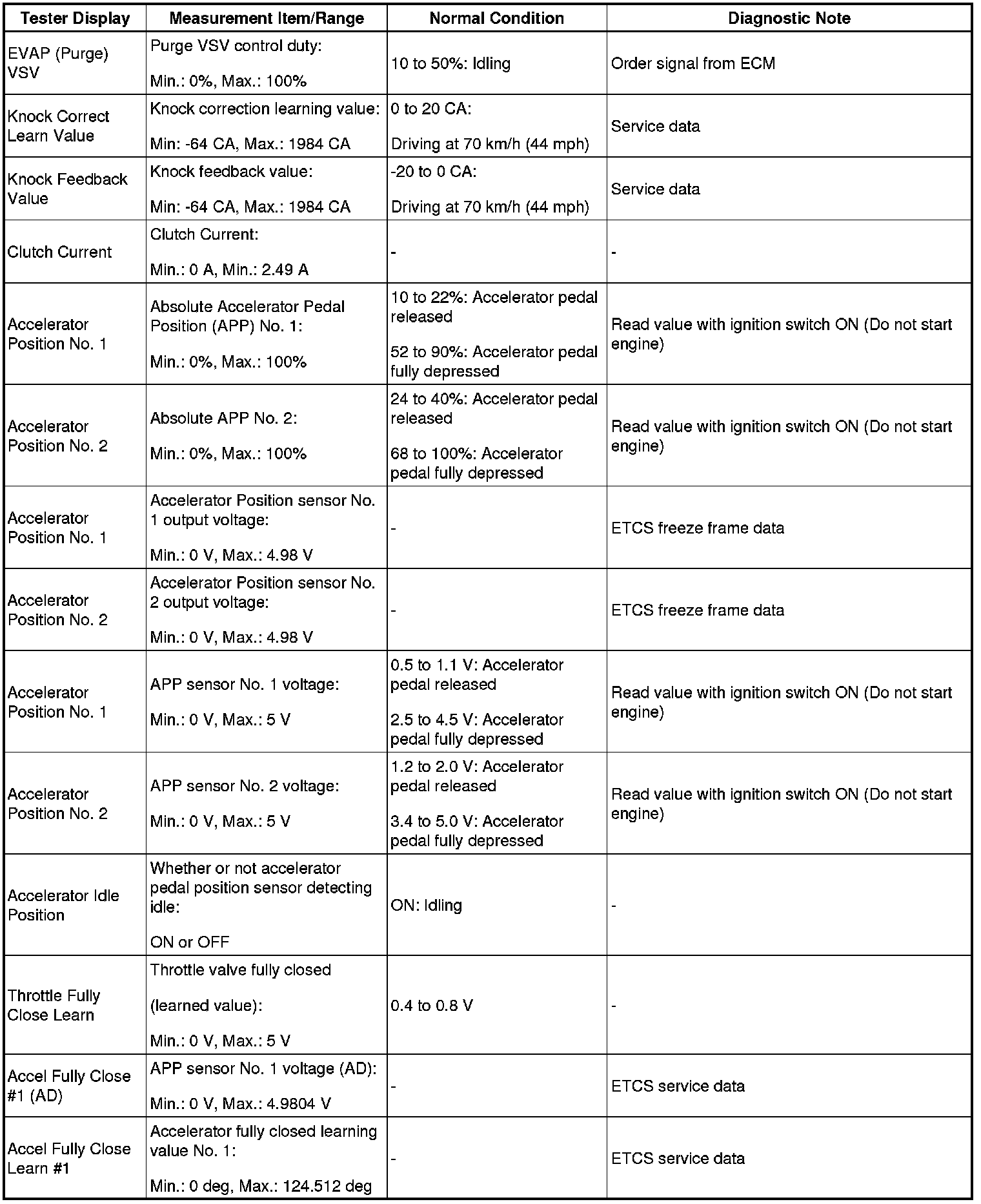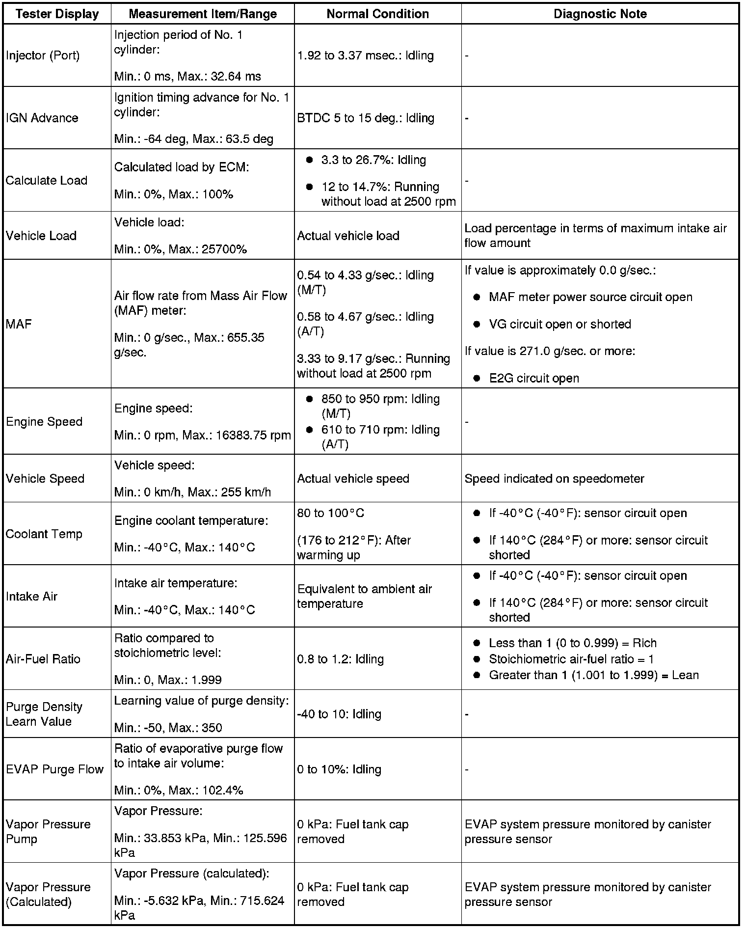 NOTE: In the table below, the values listed under Normal Condition are for reference only. Do not depend solely on these values when determining whether or not a part is faulty.