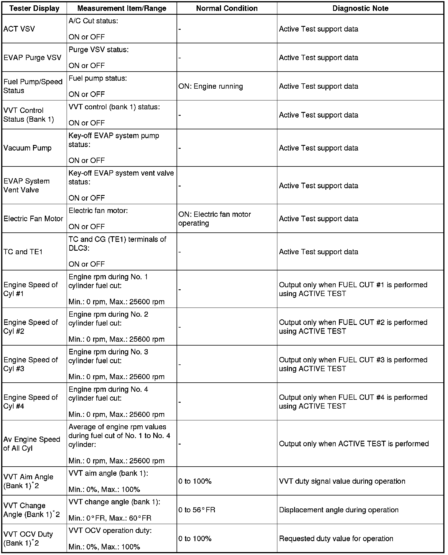 - *2: Data List values are only displayed when performing the following Active Test: VVT B1. For other Active Tests, the Data List value will be 0.