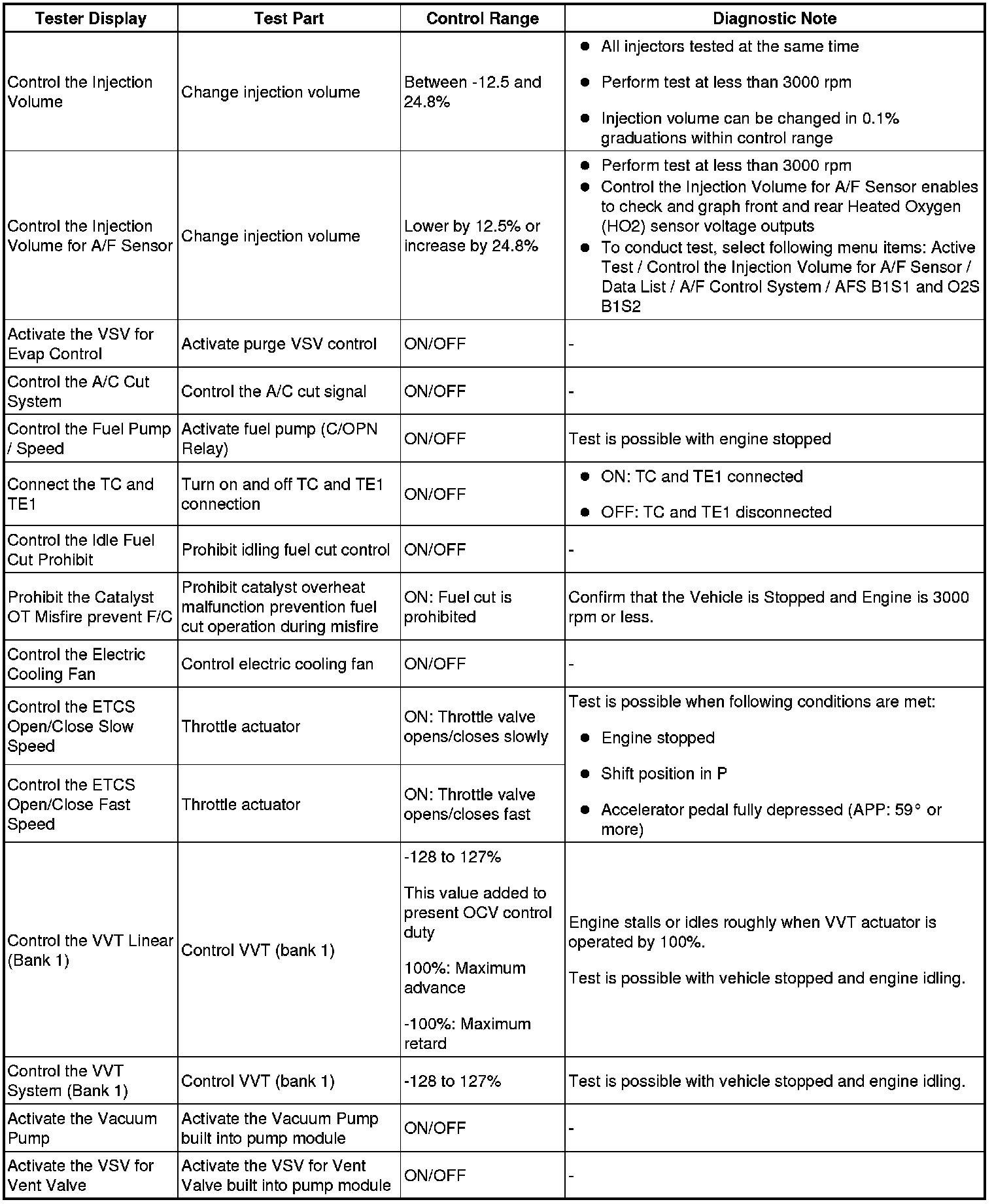 (e) Perform the Active Test by referring to the table below.