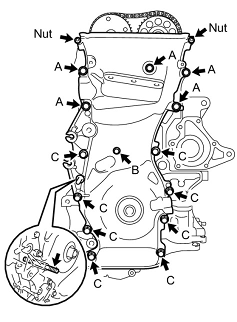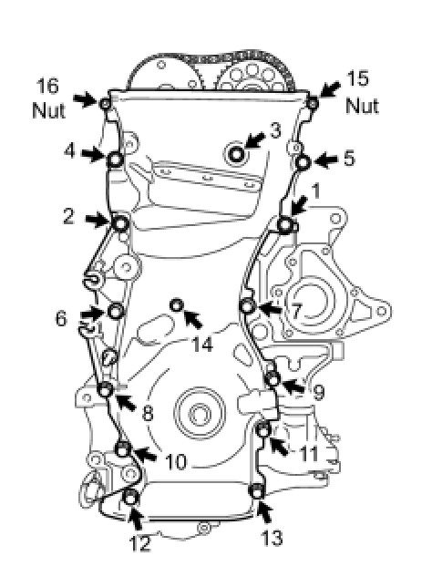 Install the timing chain cover with the 14 bolts and 2 nuts.