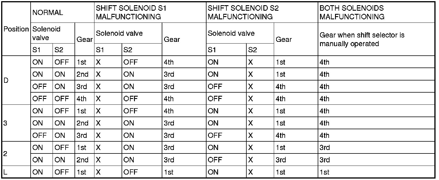 If either of the shift solenoid valve circuits has an open or short failure, the ECM turns the other shift solenoid "ON" and "OFF" in order to shift into the gear positions shown in the table below.