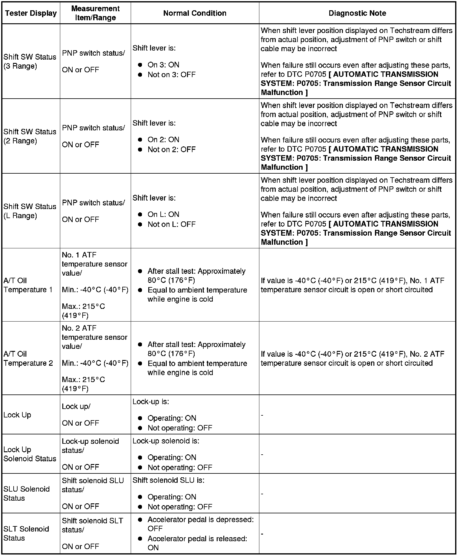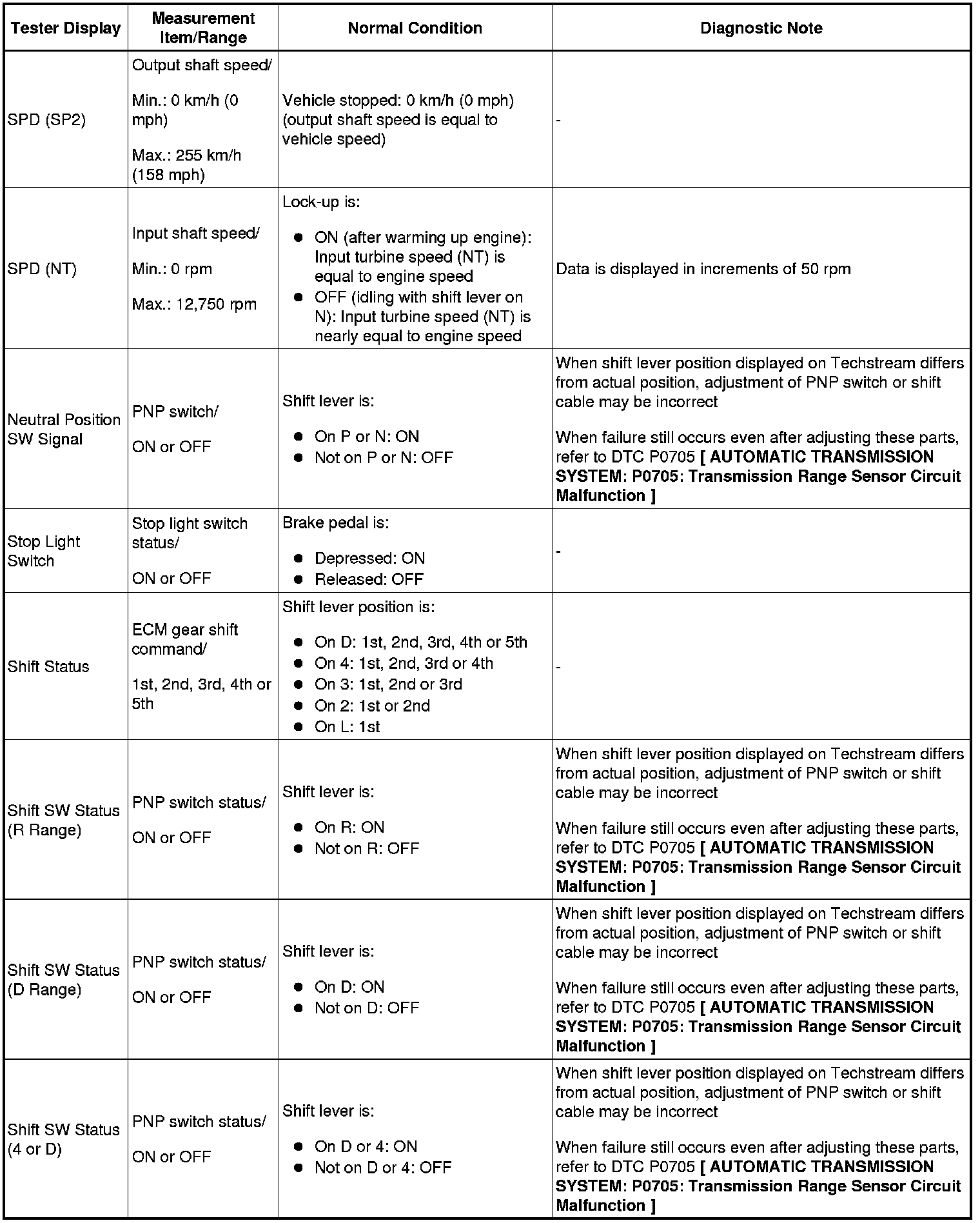 HINT: Using Techstream to read the Data List allows the values or states of switches, sensors, actuators and other items to be read without removing any parts. This non-intrusive inspection can be very useful because intermittent conditions or signals may be discovered before parts or wiring is disturbed. Reading the Data List information early in troubleshooting is one way to save diagnostic time.