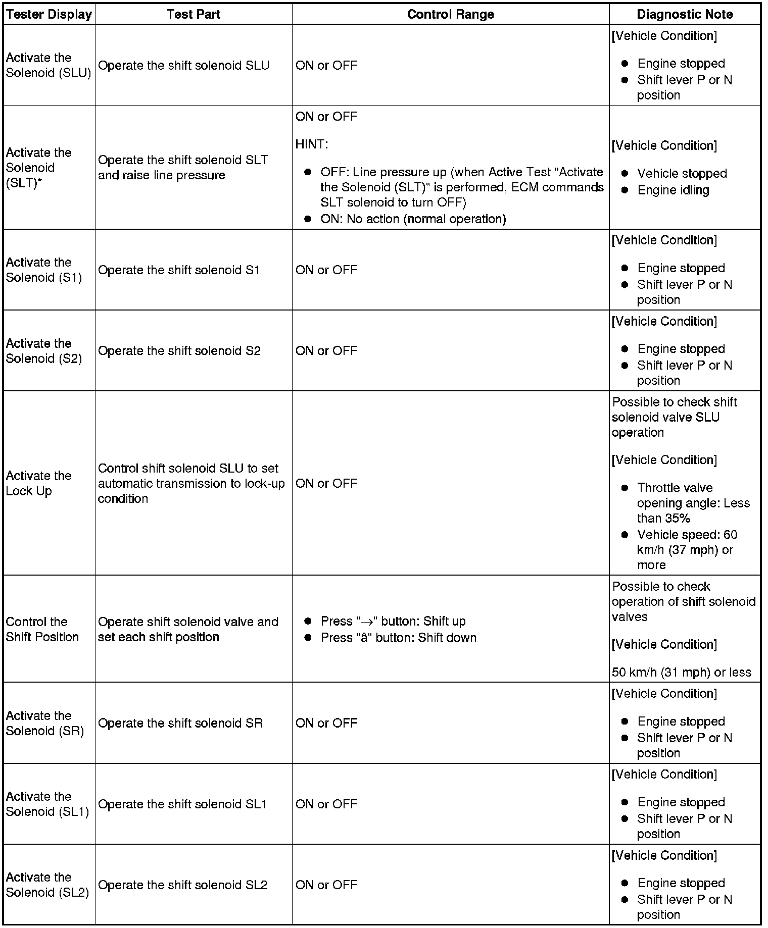 - *: Activate the Solenoid (SLT) in the Active Test is performed to check the line pressure changes by connecting SST to the automatic transmission, which is used in the Hydraulic Test (Hydraulic Test) as well.