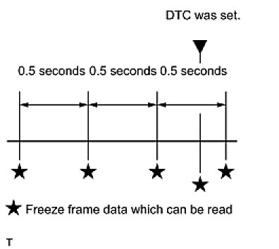 The ECM records engine conditions in the form of freeze frame data every 0.5 seconds. Using the Techstream, five separate sets of freeze frame data, including the data values at the time when the DTC was set, can be checked.
