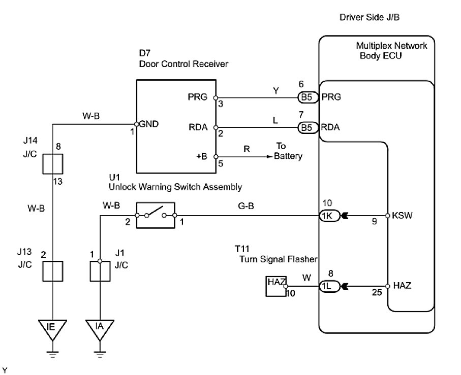 11. CHECK HARNESS AND CONNECTOR (UNLOCK WARNING SWITCH - DRIVER SIDE J/B AND BODY GROUND)