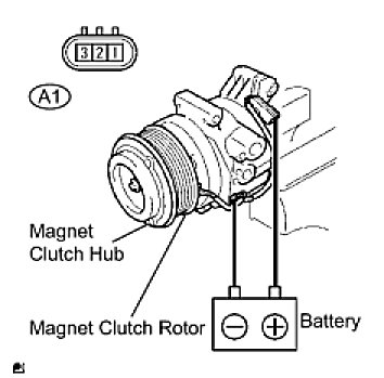 (b) Confirm that the magnet clutch hub and magnet clutch rotor lock when the battery positive lead is connected to terminal 1 (MG+) of the magnet clutch, and the negative lead is connected to the earth wire.