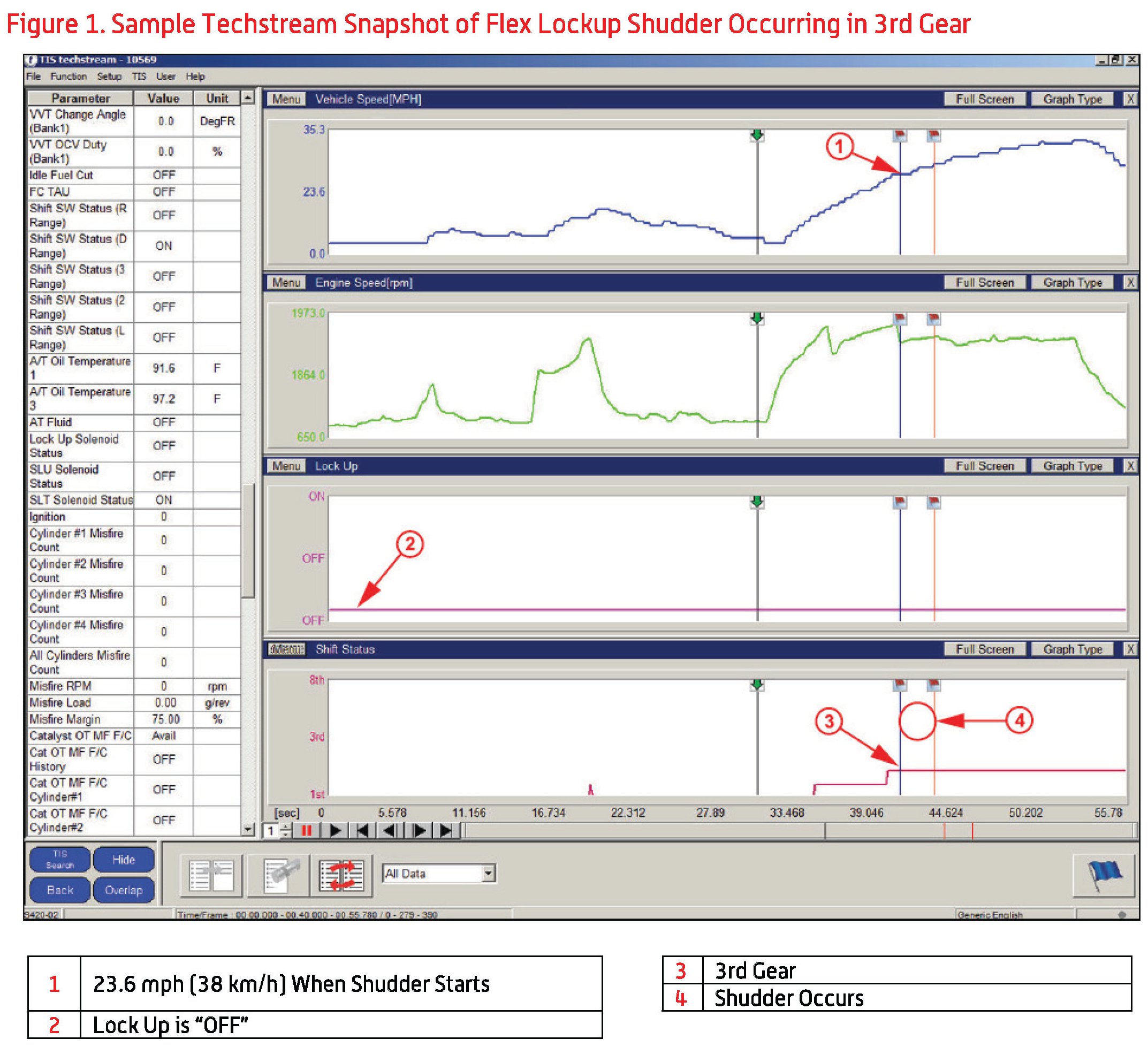 2. Use TIS Techstream to take a snapshot when shudder vibration is occurring to confirm that it occurs when in 3rd or 4th gear while lightly accelerating.