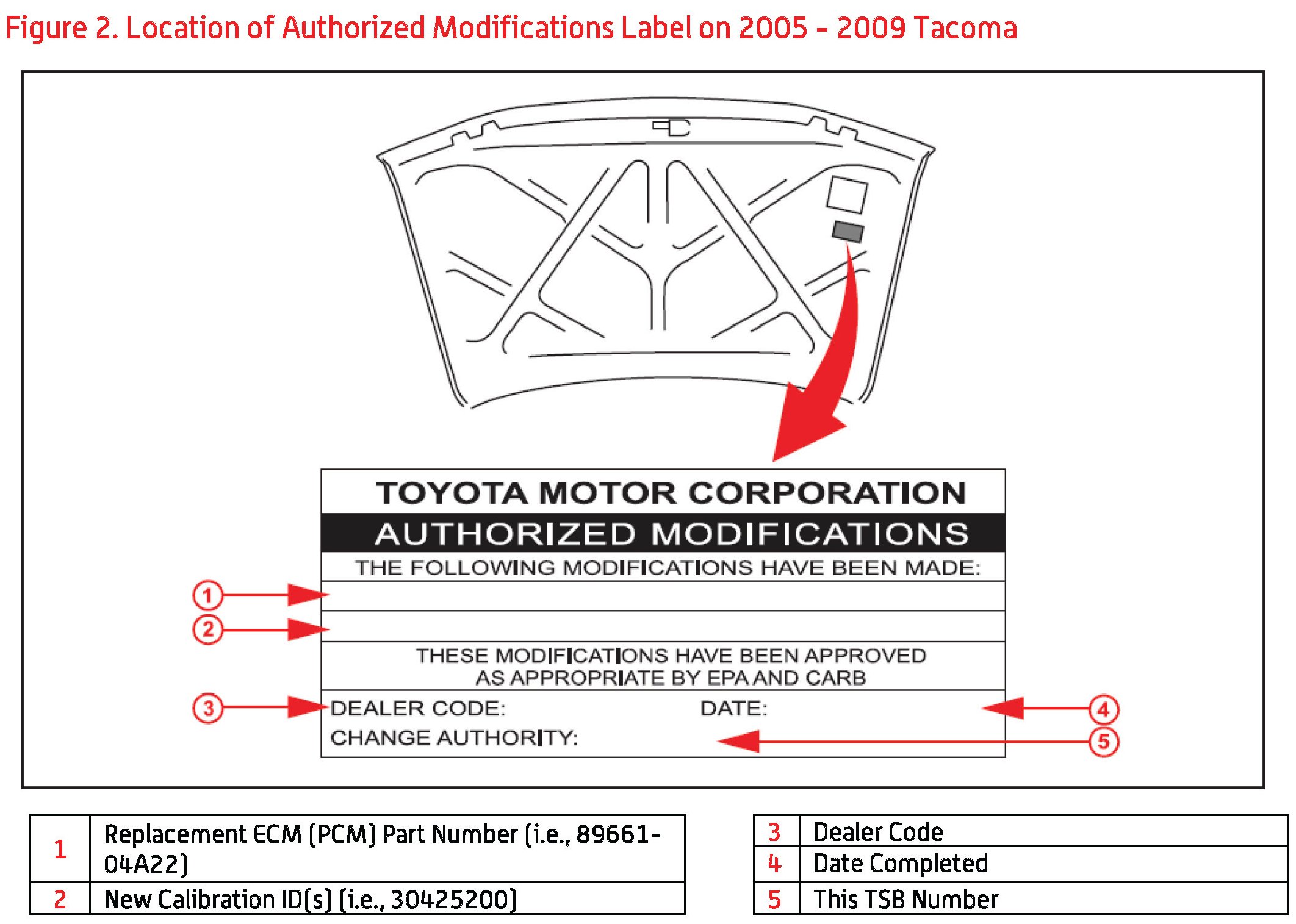 5. Check for the Authorized Modifications Label affixed to the vehicle in the location shown in Figure 2. Confirm if the ECM (PCM) calibration has been updated using Techstream Health check. If the calibration ID listed is NOT the latest ECM (PCM) calibration - go to step 6.