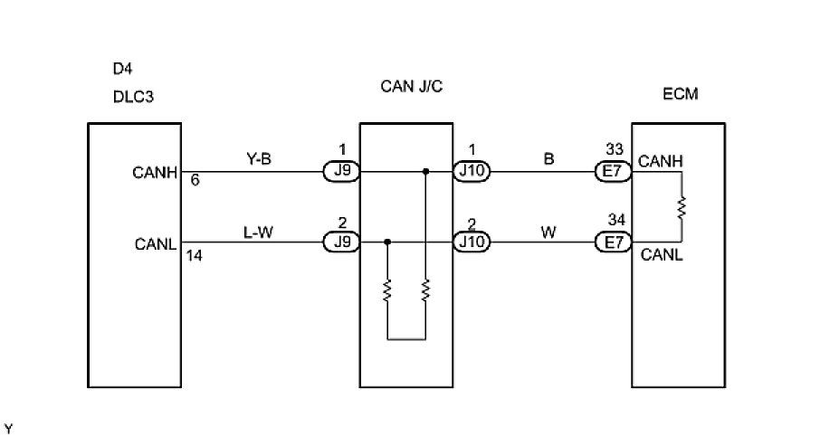 The CAN main bus line and DLC3 sub bus line may have a disconnection when the resistance between terminals 6 (CANH) and 14 (CANL) of the DLC3 is more than 69 Ohms.
