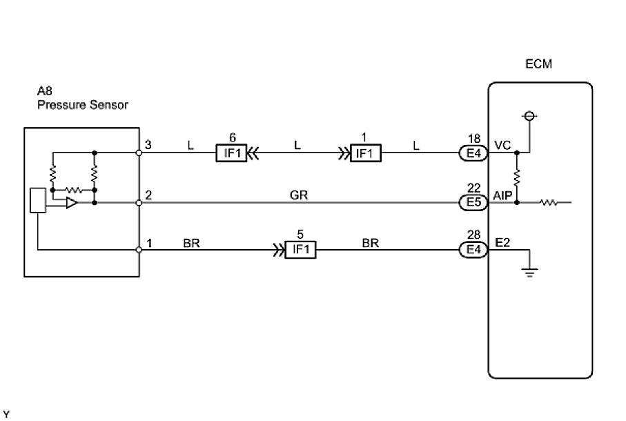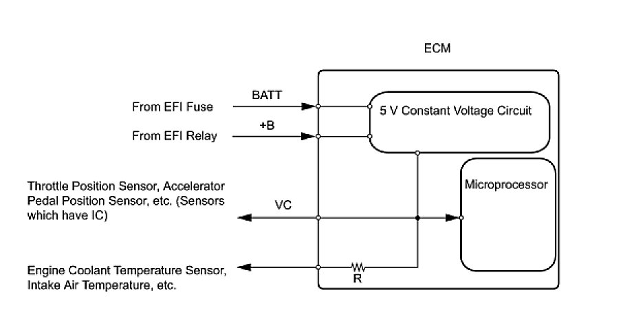 The ECM constantly generates 5 V power from the battery voltage supplied to the +B (BATT) terminal to operate the microprocessor. The ECM also provides this power to the sensors through the VC output circuit.