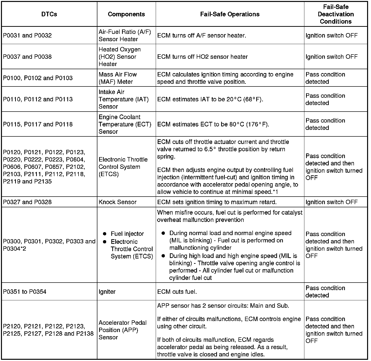 If any of the following DTCs are set, the ECM enters fail-safe mode to allow the vehicle to be driven temporarily.