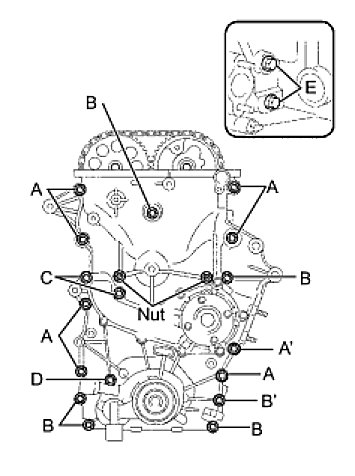 - Provisionally install the oil pump with the 19 bolts and 2 nuts.