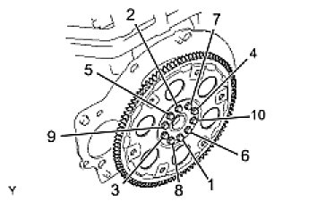 DRIVE PLATE and RING GEAR SUB-ASSEMBLY (for Automatic Transmission)Using several steps, uniformly install and tighten the 10 bolts in the sequence shown in the illustration.