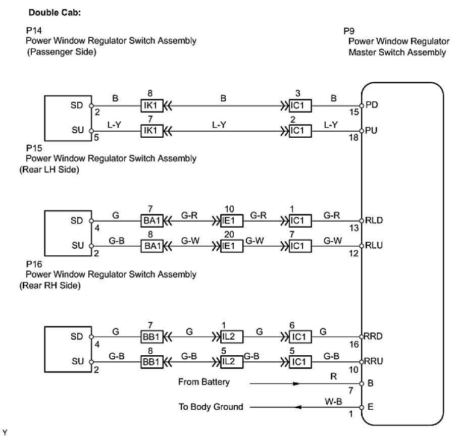 - With the ignition switch ON, the power window regulator master switch assembly transmits remote switch signals to the passenger side power window and rear door power window regulator switches. Then, the regulator switches drive the power window regulator motors.