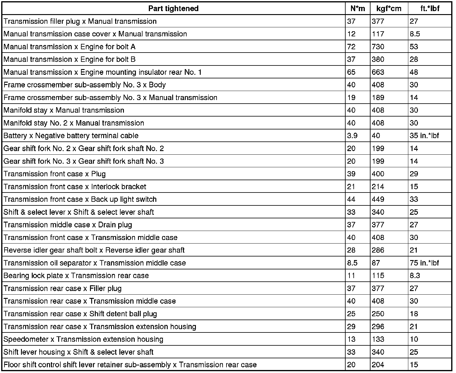 SERVICE SPECIFICATIONS: RA60 MANUAL TRANSMISSION: TORQUE SPECIFICATIONS