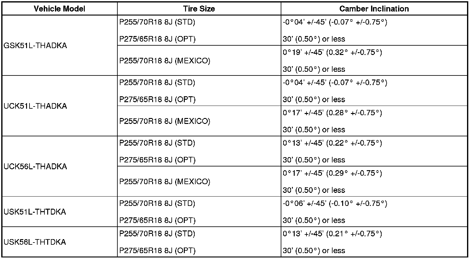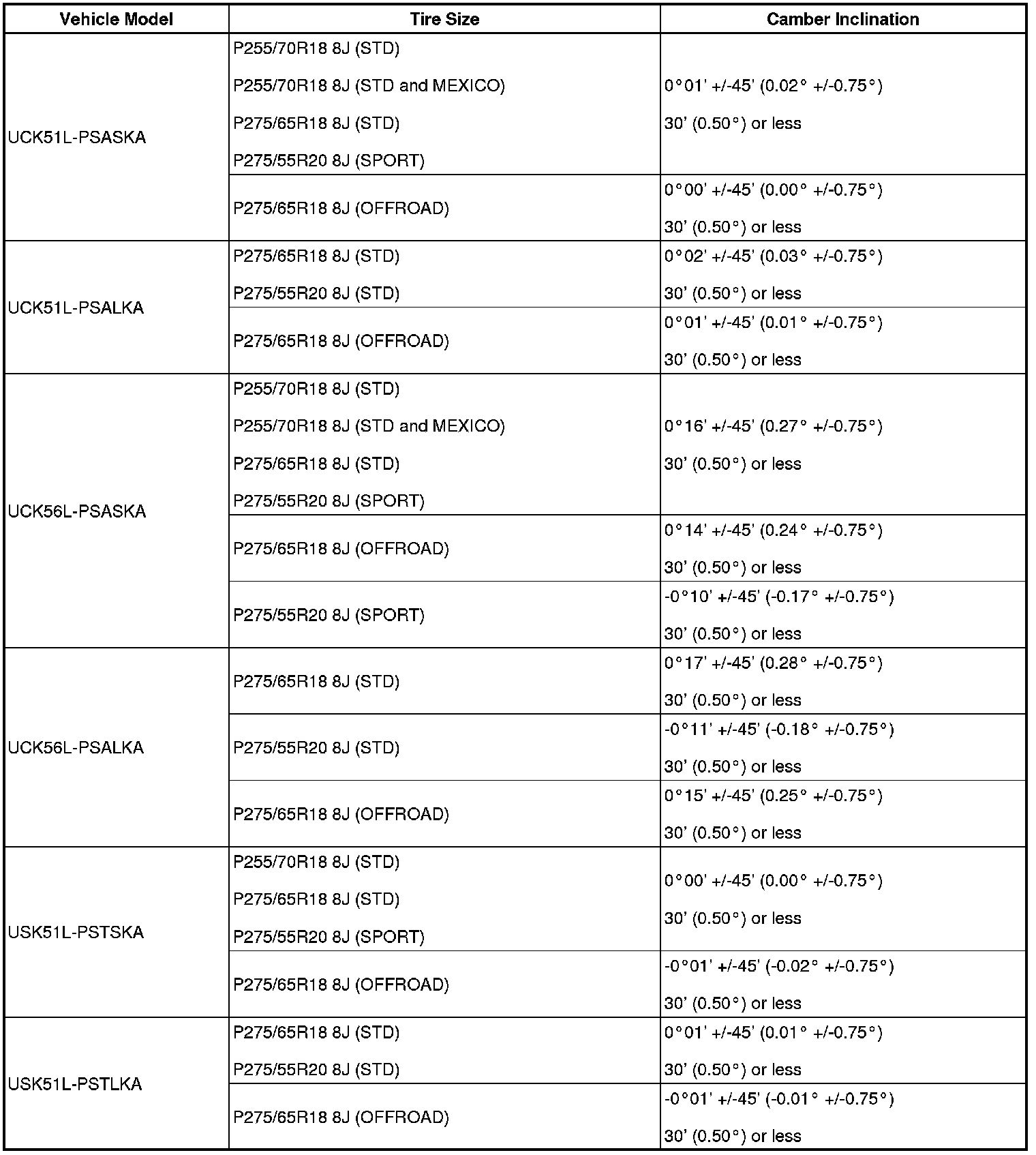 Standard camber inclination (unloaded vehicle):