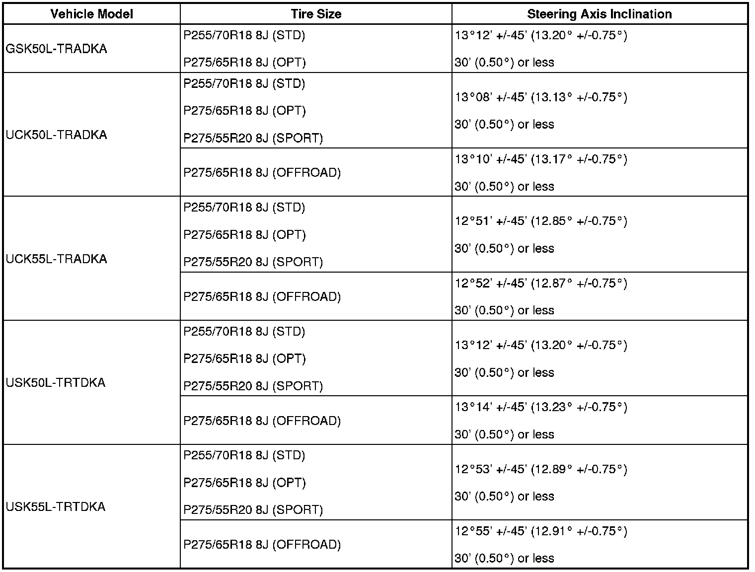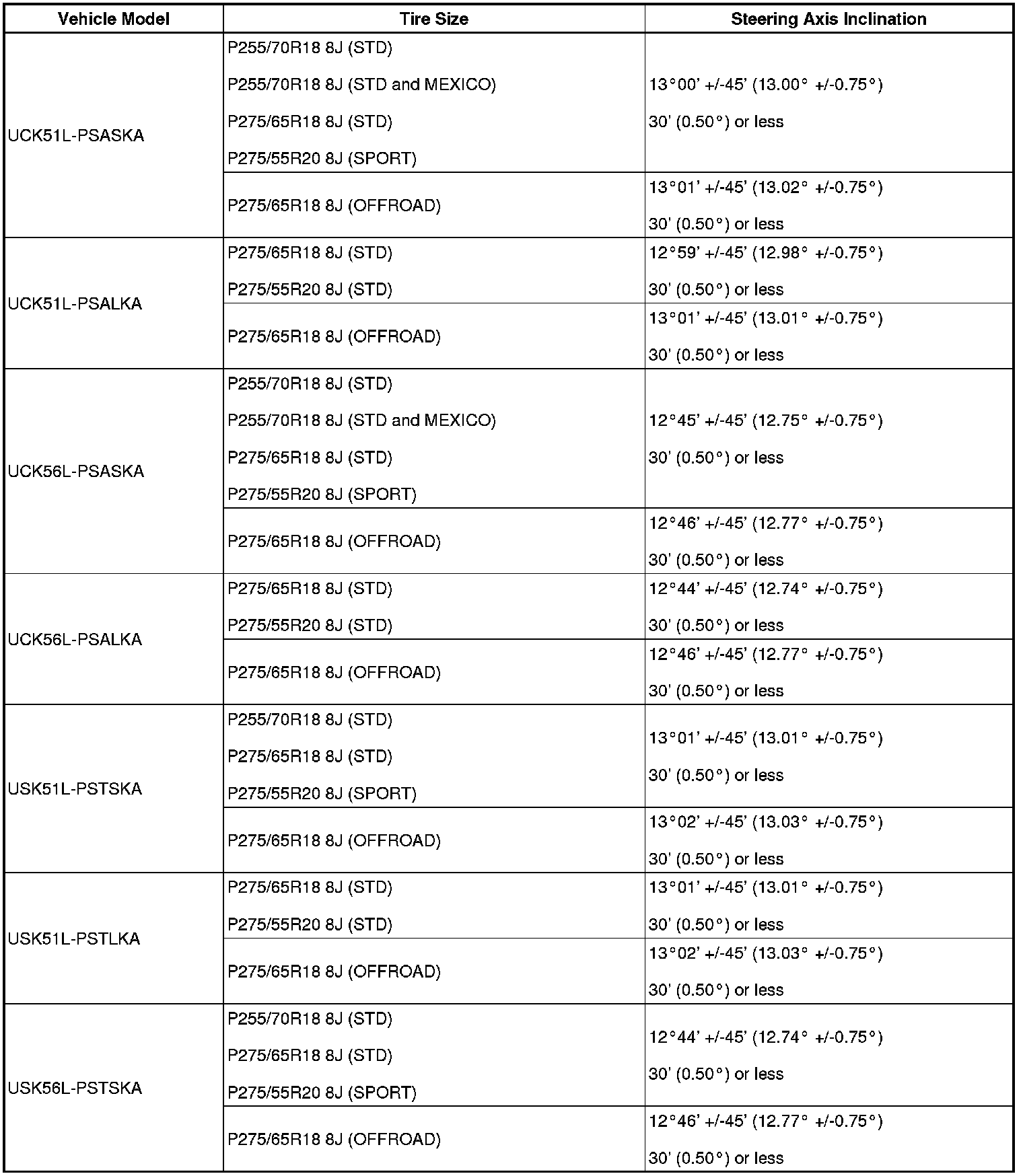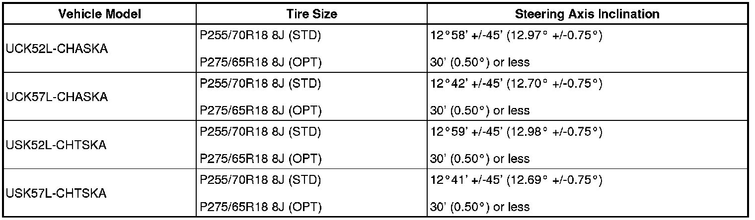 Standard steering axis inclination (unloaded vehicle):
