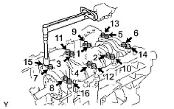 Using several steps, install the 8 bearing cap bolts uniformly in the sequence shown in the illustration.