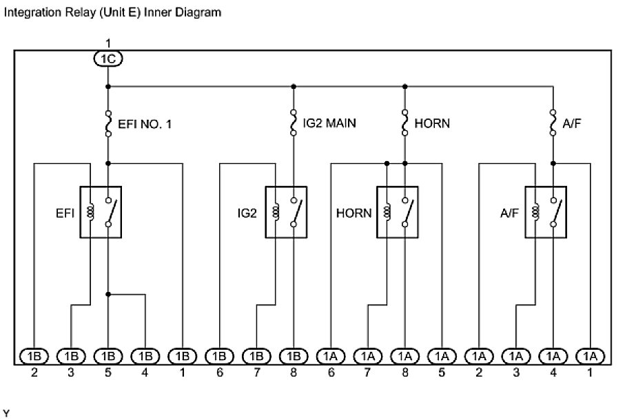 - The internal circuit of the integration relay is as shown in the illustration below. Inspect the integration relay using the following procedures.