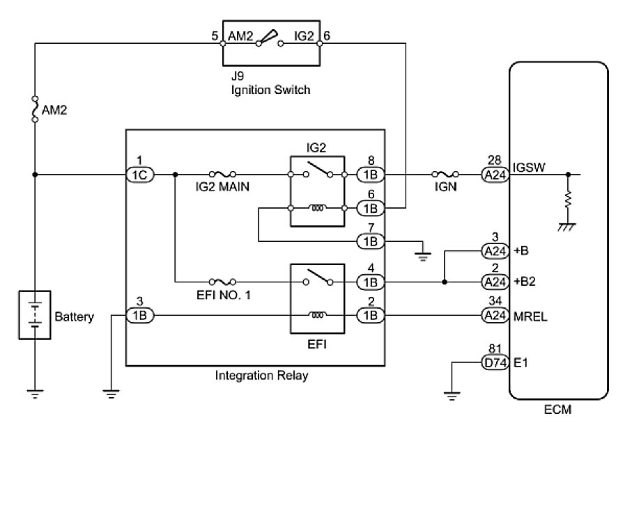 When the ignition switch is turned to ON, the battery voltage is applied to the IGSW of the ECM. The output signal from the MREL terminal of the ECM causes a current to flow to the coil, closing the contacts of the integration relay (EFI relay) and supplying power to either terminal +B or +B2 of the ECM.
