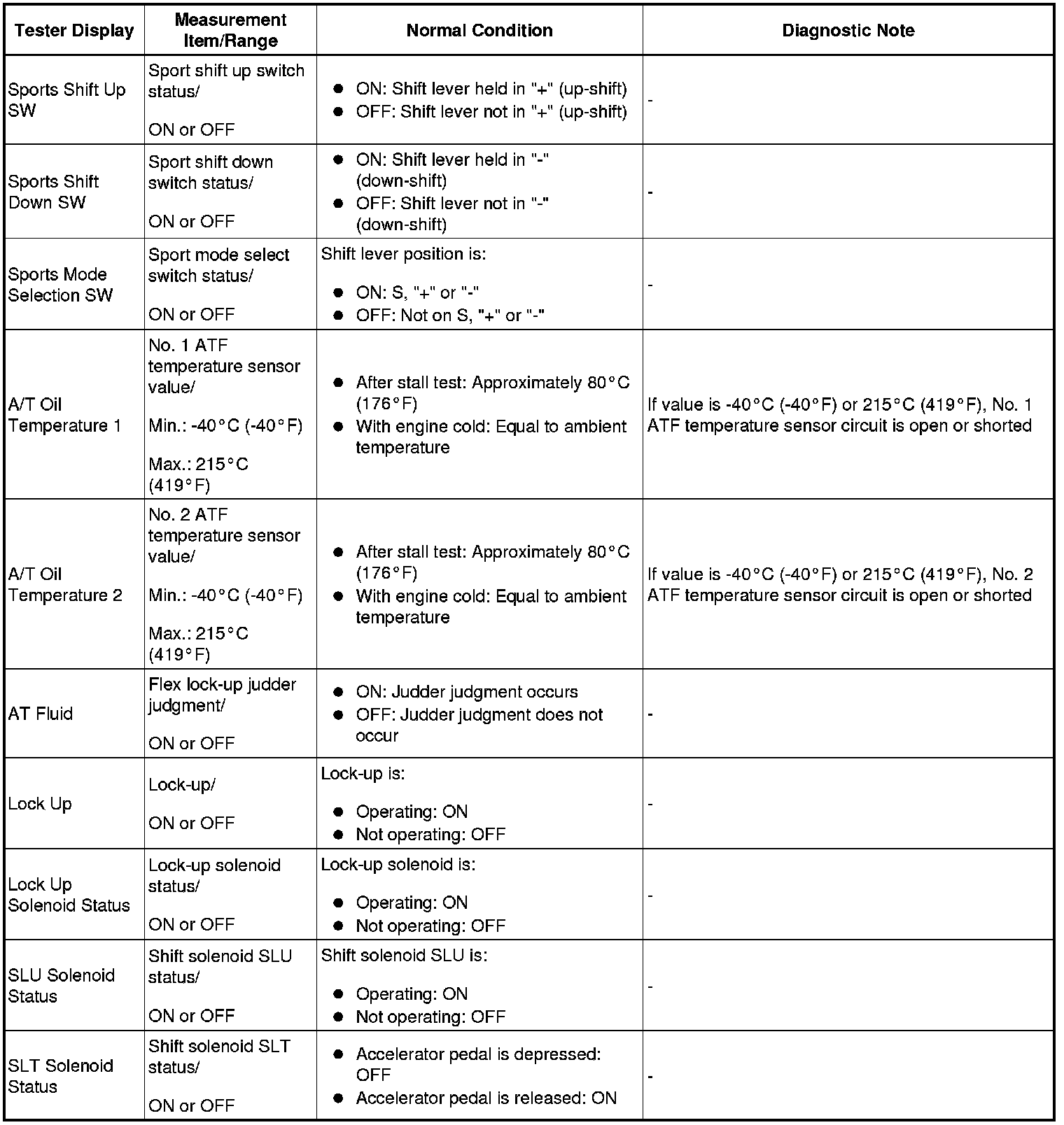 HINT: *: Activate the Solenoid (SLT) in the Active Test is performed to check the line pressure changes by connecting SST to the automatic transmission, which is used in the HYDRAULIC TEST (Hydraulic Test) as well. Note that the pressure values in the Active Test and HYDRAULIC TEST are different.