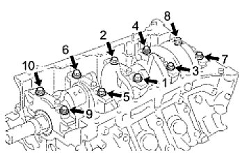 - Uniformly tighten the 10 crankshaft bearing cap bolts in several passes in the sequence shown in the illustration.