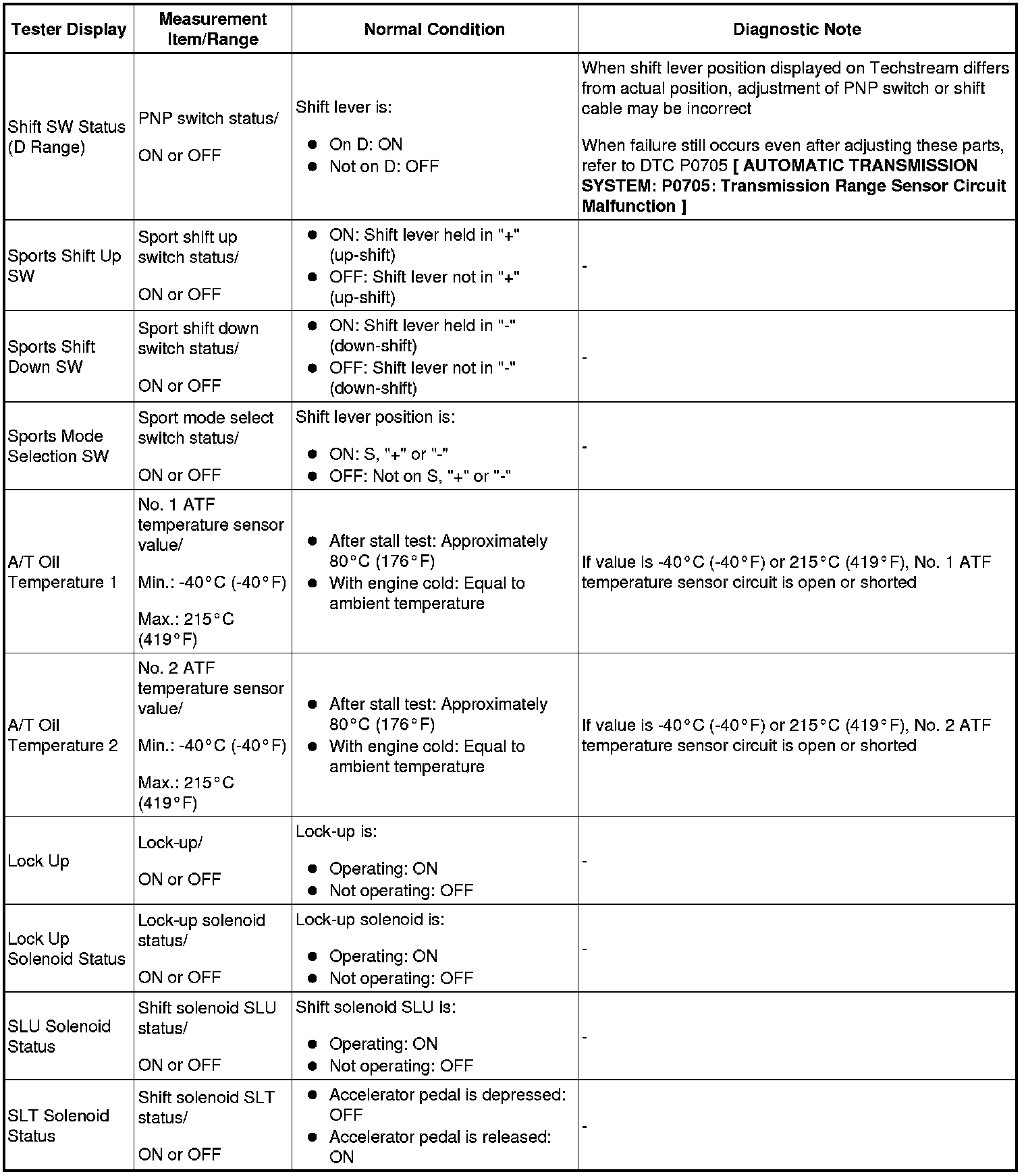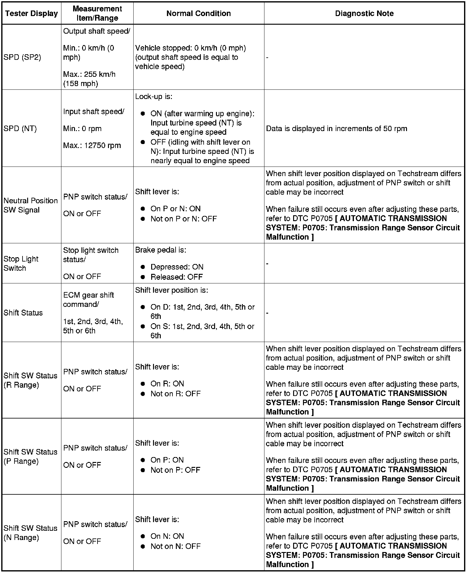 HINT: Using the Techstream to read the Data List allows the values or states of switches, sensors, actuators and other items to be read without removing any parts. This non-intrusive inspection can be very useful because intermittent conditions or signals may be discovered before parts or wiring is disturbed. Reading the Data List information early in troubleshooting is one way to save diagnostic time.