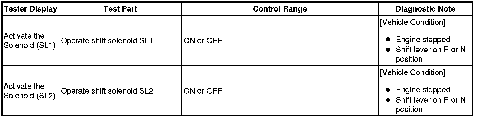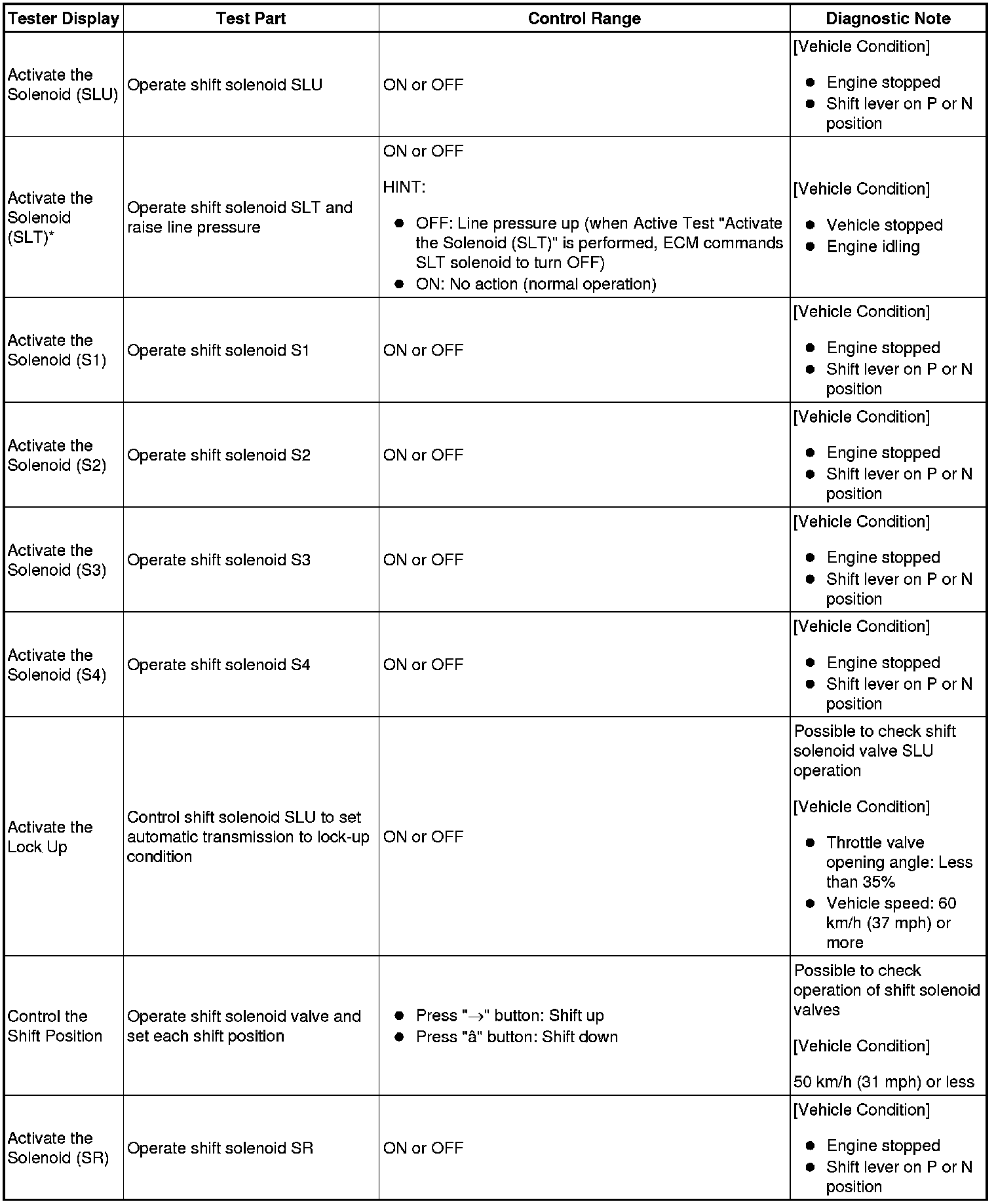 HINT: *: Activate the Solenoid (SLT) in the Active Test is performed to check the line pressure changes by connecting SST to the automatic transmission, which is used in the HYDRAULIC TEST (Hydraulic Test) as well. Note that the pressure values in the Active Test and HYDRAULIC TEST are different.