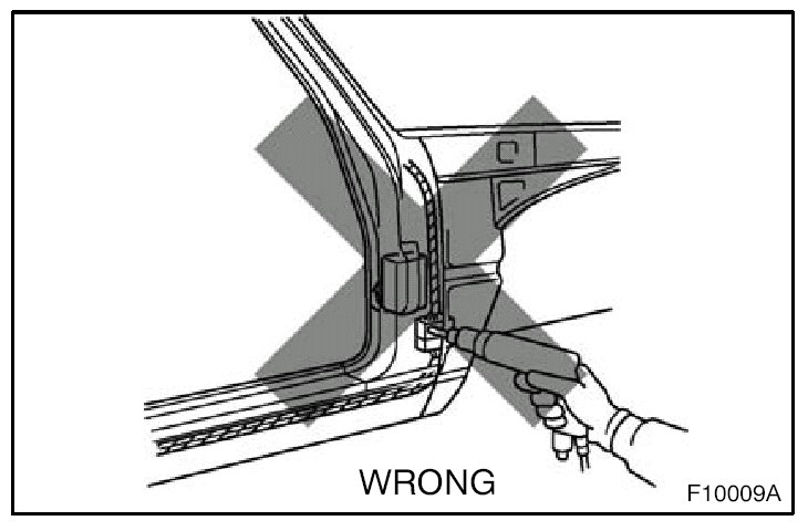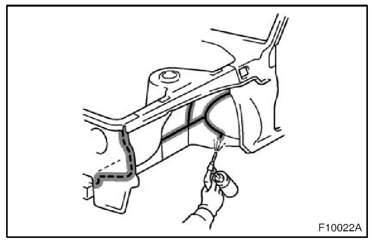 1. For water-proofing and anti-corrosion measures, always apply the body sealer to the body panel seams and hems of the doors, hood, etc.