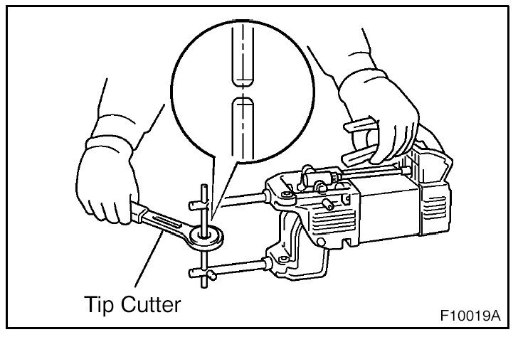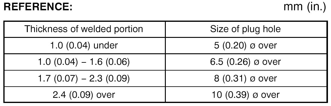 1. When welding panels with a combined thickness of over 3 mm (0.12 in.), use a MIG (Metal Inert Gas) welder for plug welding.