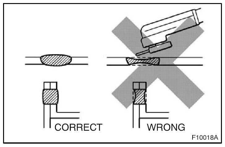 2. Plug welding should be done with a MIG (Metal Inert Gas) welder. Do not gas weld or braze panels at areas other than specified.