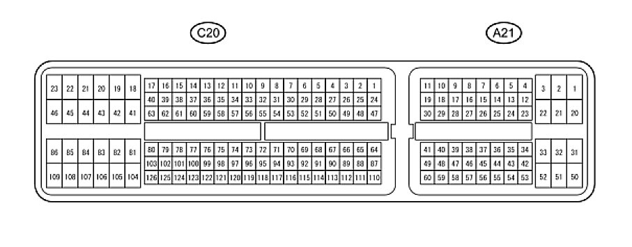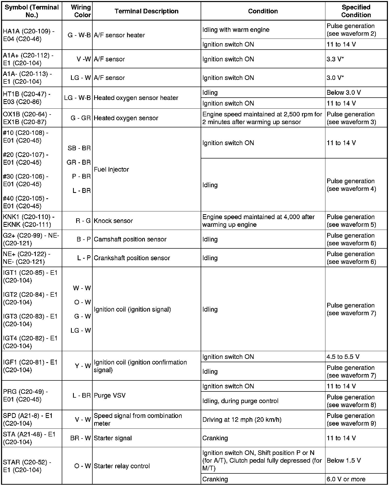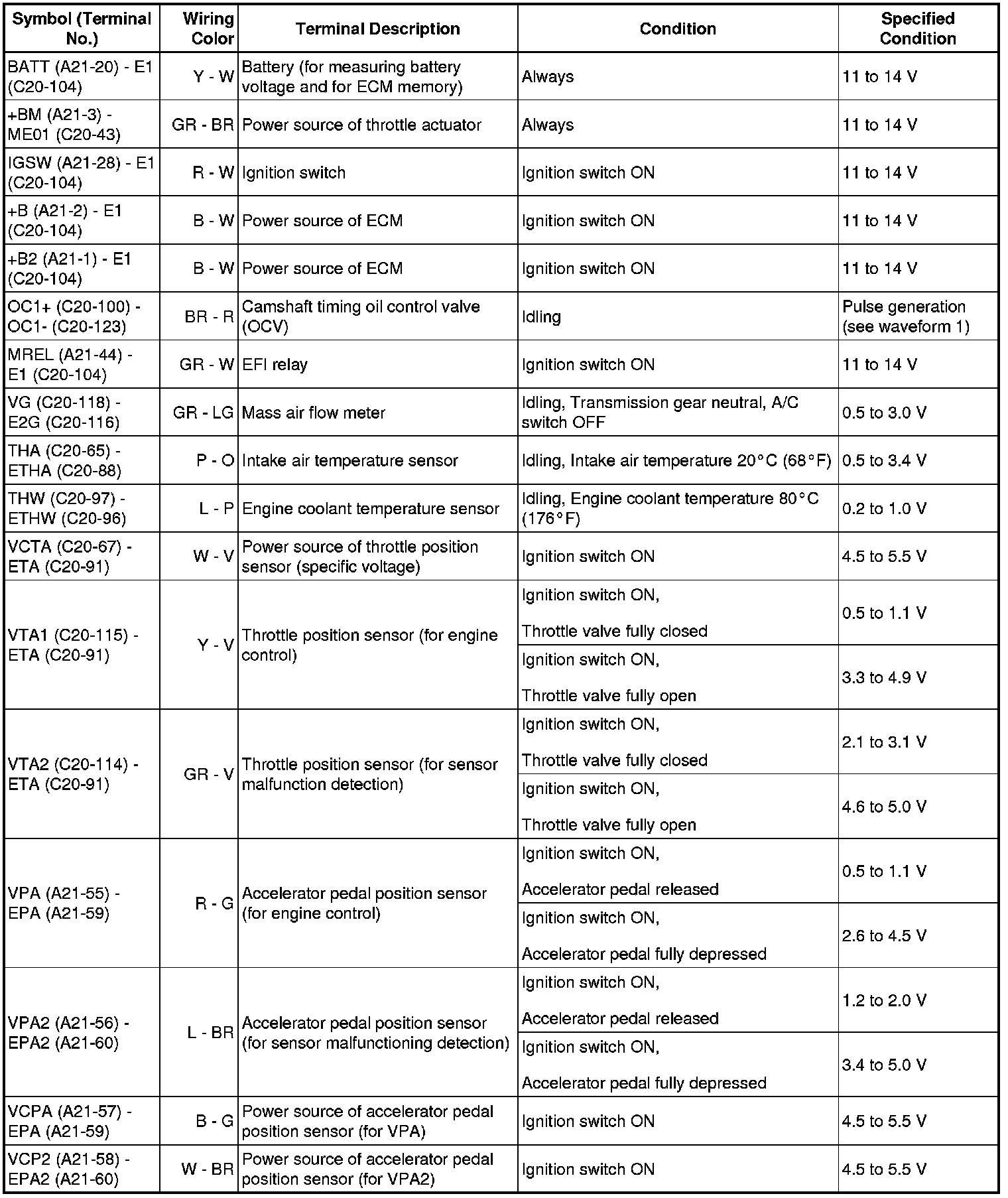 HINT: The standard normal voltage between each pair of ECM terminals is shown in the table below. The appropriate conditions for checking each pair of terminals are also indicated. The result of checks should be compared with the standard normal voltage for that pair of terminals, displayed in the Specified Condition column. The illustration above can be used as a reference to identify the ECM terminal locations.