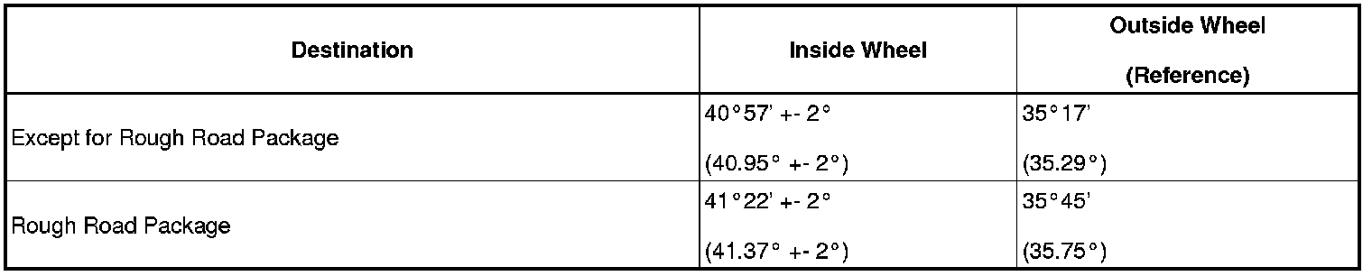 If the right and left inside wheel angles are not within the specified range, check the right and left rack end lengths.