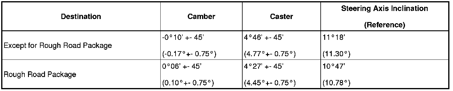 The body and suspension may be damaged if the camber is not correctly adjusted in accordance with the above table.