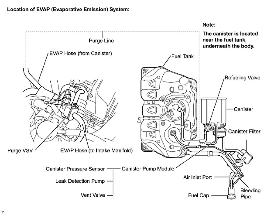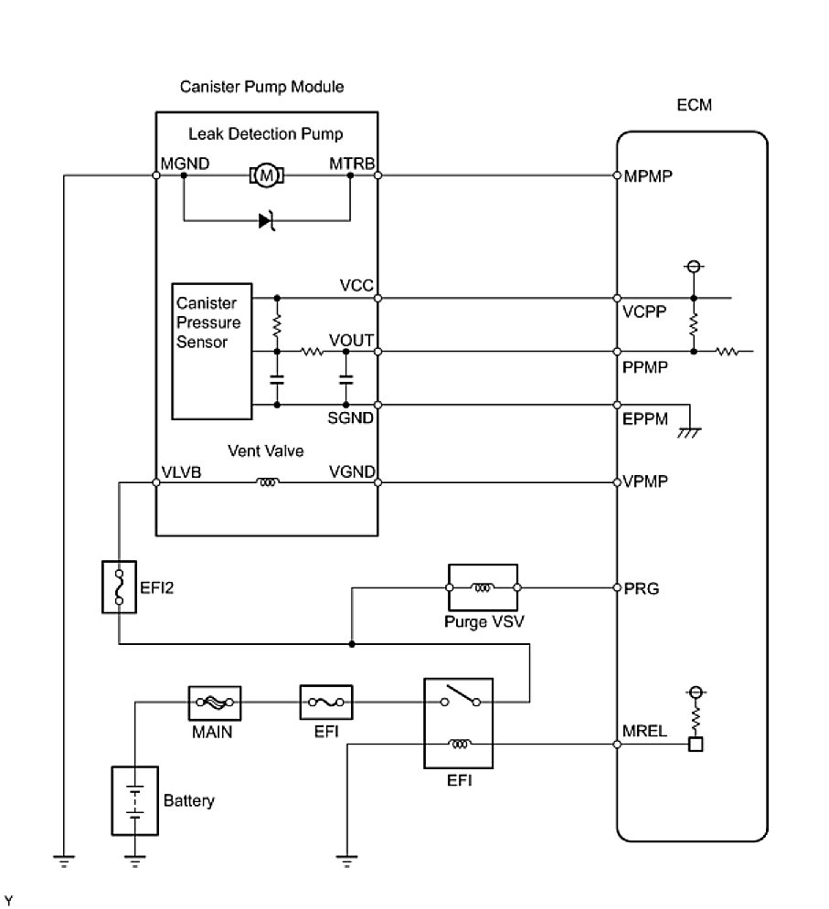 The leak detection pump creates negative pressure (vacuum) in the EVAP system and the pressure is measured. Finally, the ECM monitors for leaks from the EVAP system, and malfunctions in both the canister pump module and purge VSV, based on the EVAP pressure.