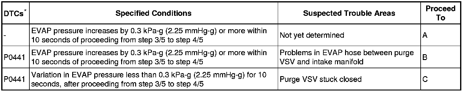 The vent valve is turned ON (closed) and the EVAP pressure is measured. If the variation in the pressure is less than 0.5 kPa-g (3.75 mmHg-g), the ECM interprets this as the purge VSV being stuck closed, and illuminates the MIL and sets DTC P0441 (2 trip detection logic).