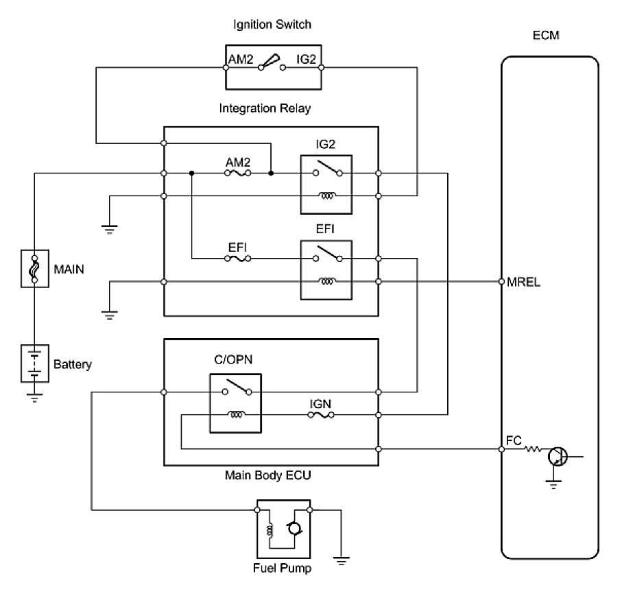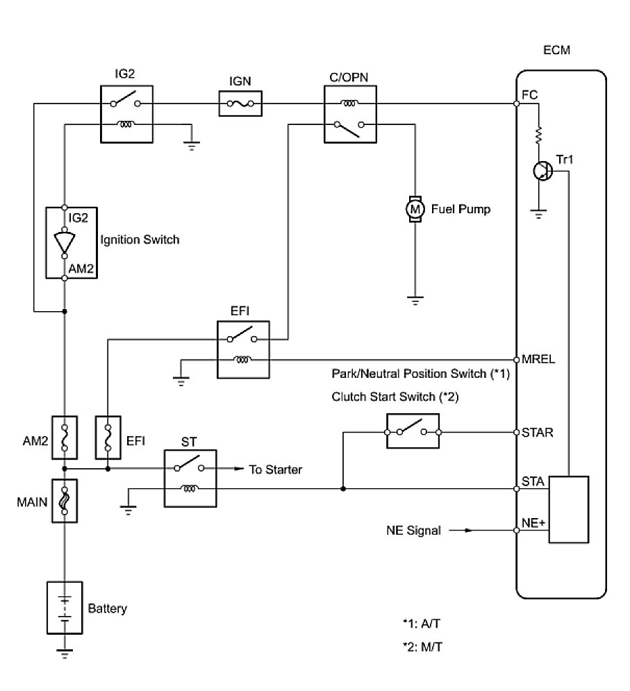 When the engine is cranked, the starter relay drive signal output from the STAR terminal of the ECM is input into the STA terminal of the ECM, and NE signal generated by the crankshaft position sensor is also input into the NE+ terminal. Thus, the ECM interprets that the engine is cranked, and turns the transistor Tr1 in the ECM internal circuit ON. The current flows to the C/OPN (Circuit Opening) relay by turning the Tr1 ON. Then, the fuel pump operates.